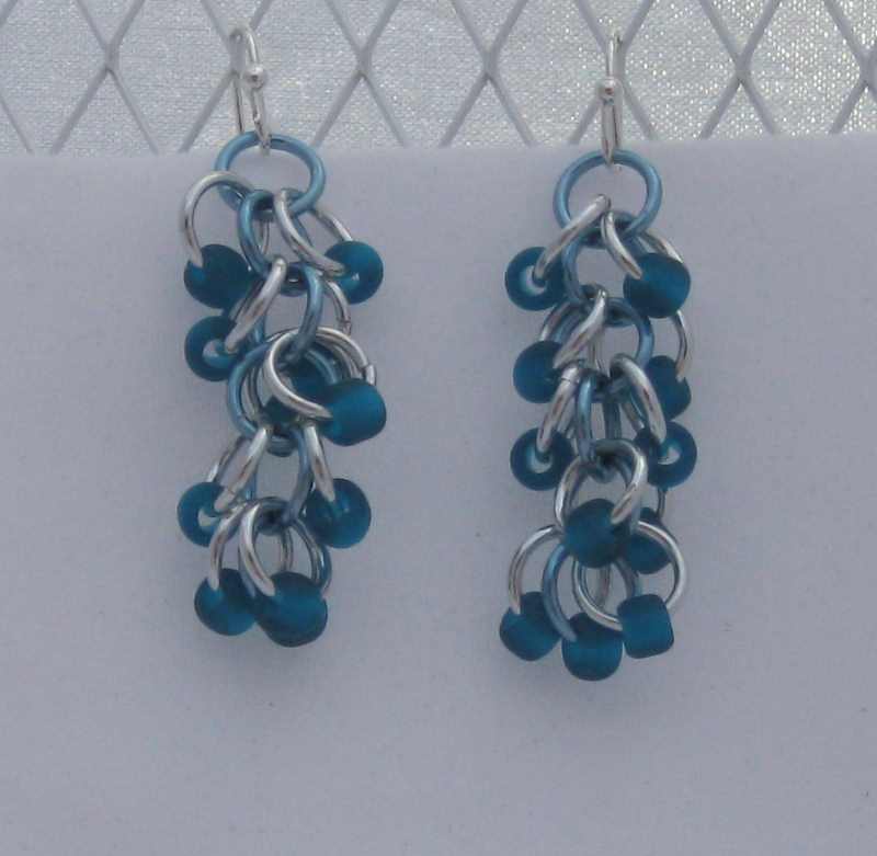 Anodized aluminum rings and glass beads colors: bright silver, sky, and matte teal beads beads weave: shaggy loops size: 1  5/8