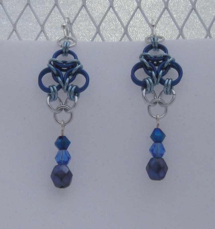 Handmade chain maille earrings e10134 Posted on October 21, 2014 by donnaw39 under Earrings Anodized aluminum rings with crystal beadscolors: royal blue, sky, and bright silverweave: aurasize: 1 3/4